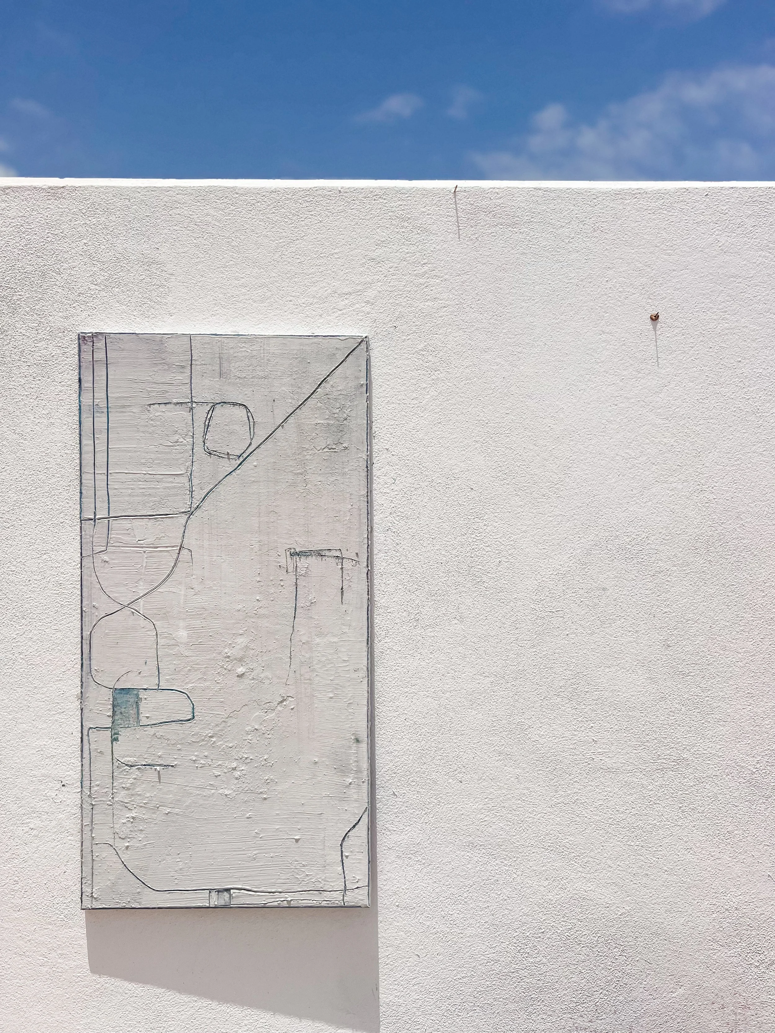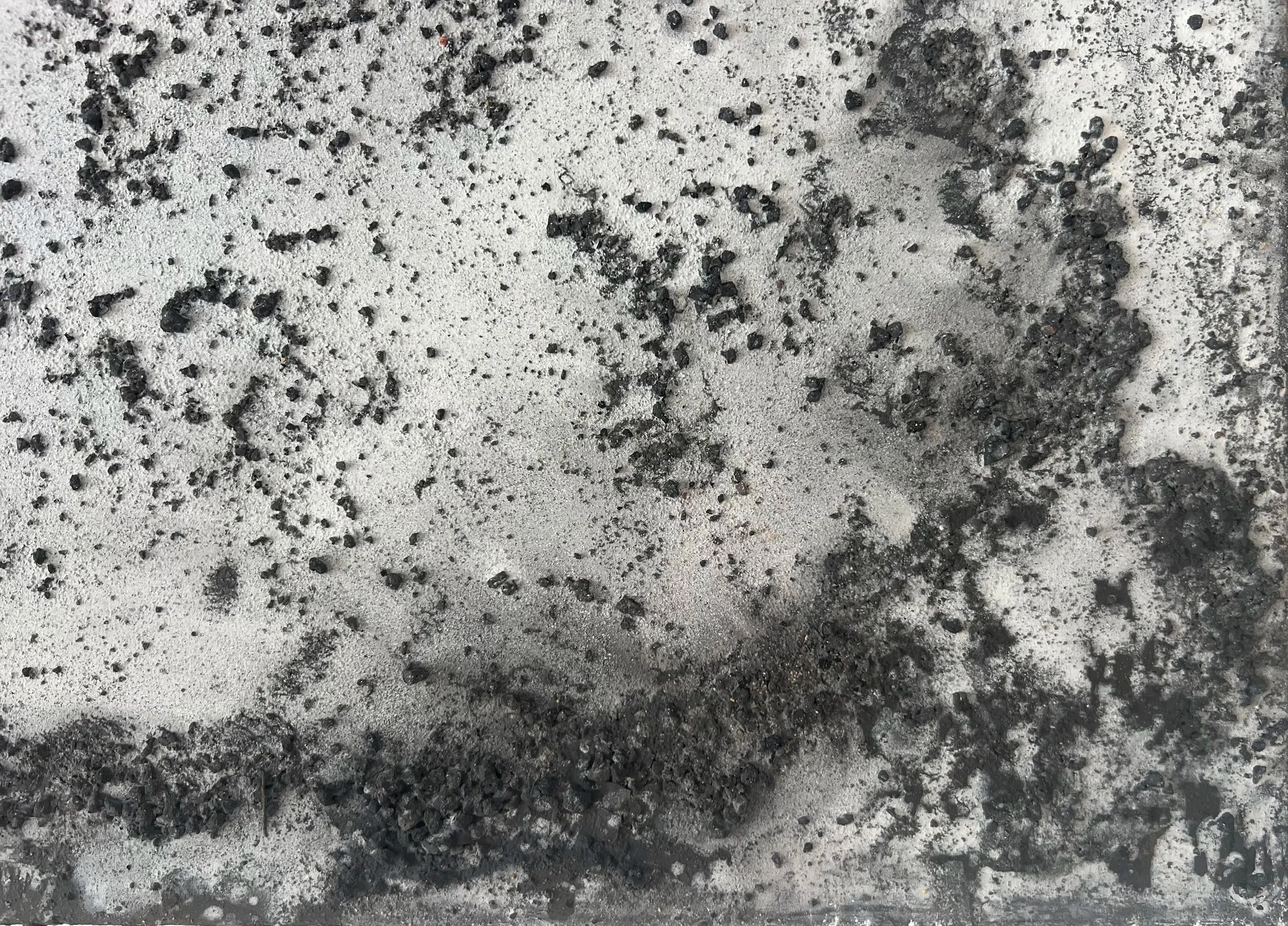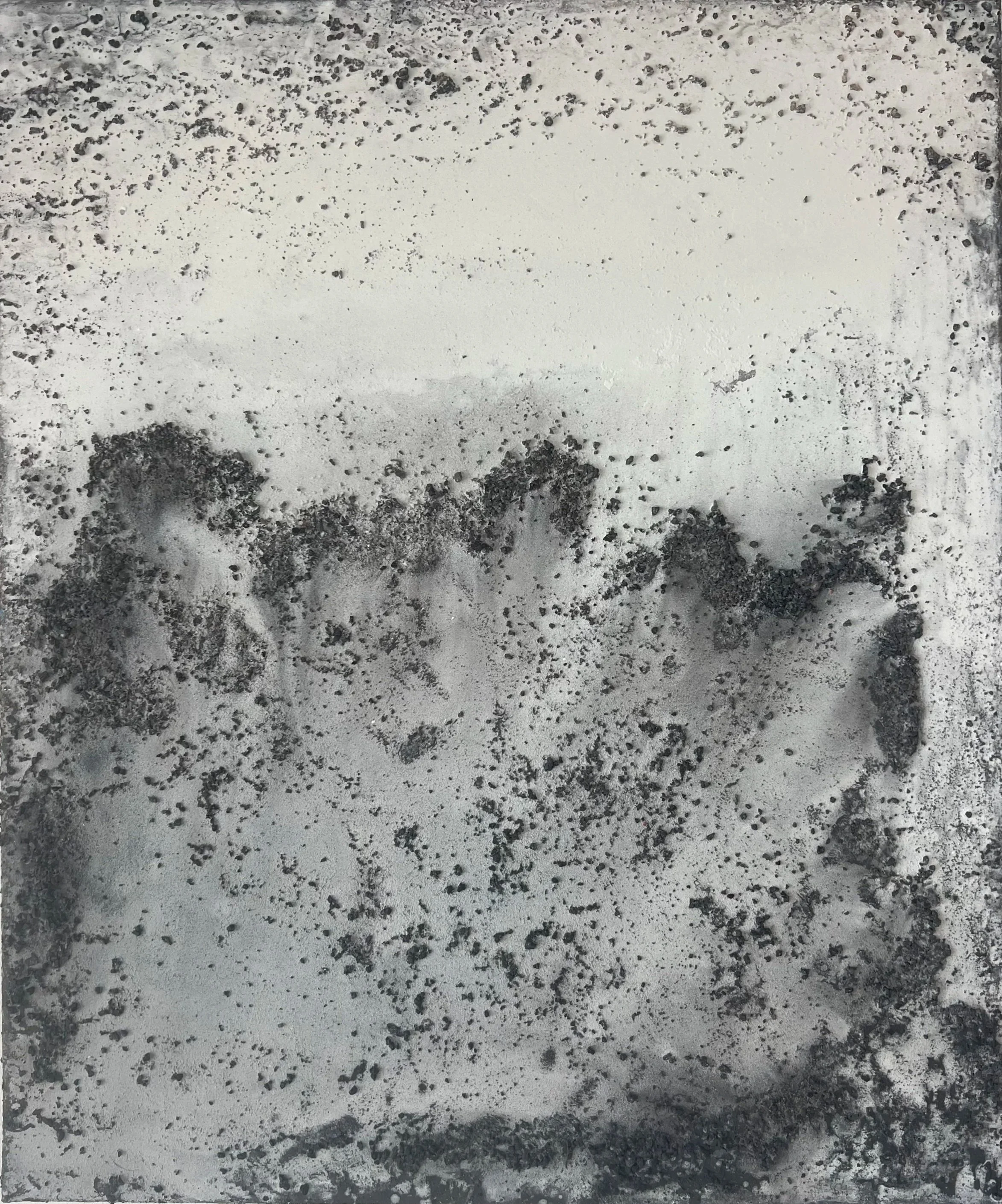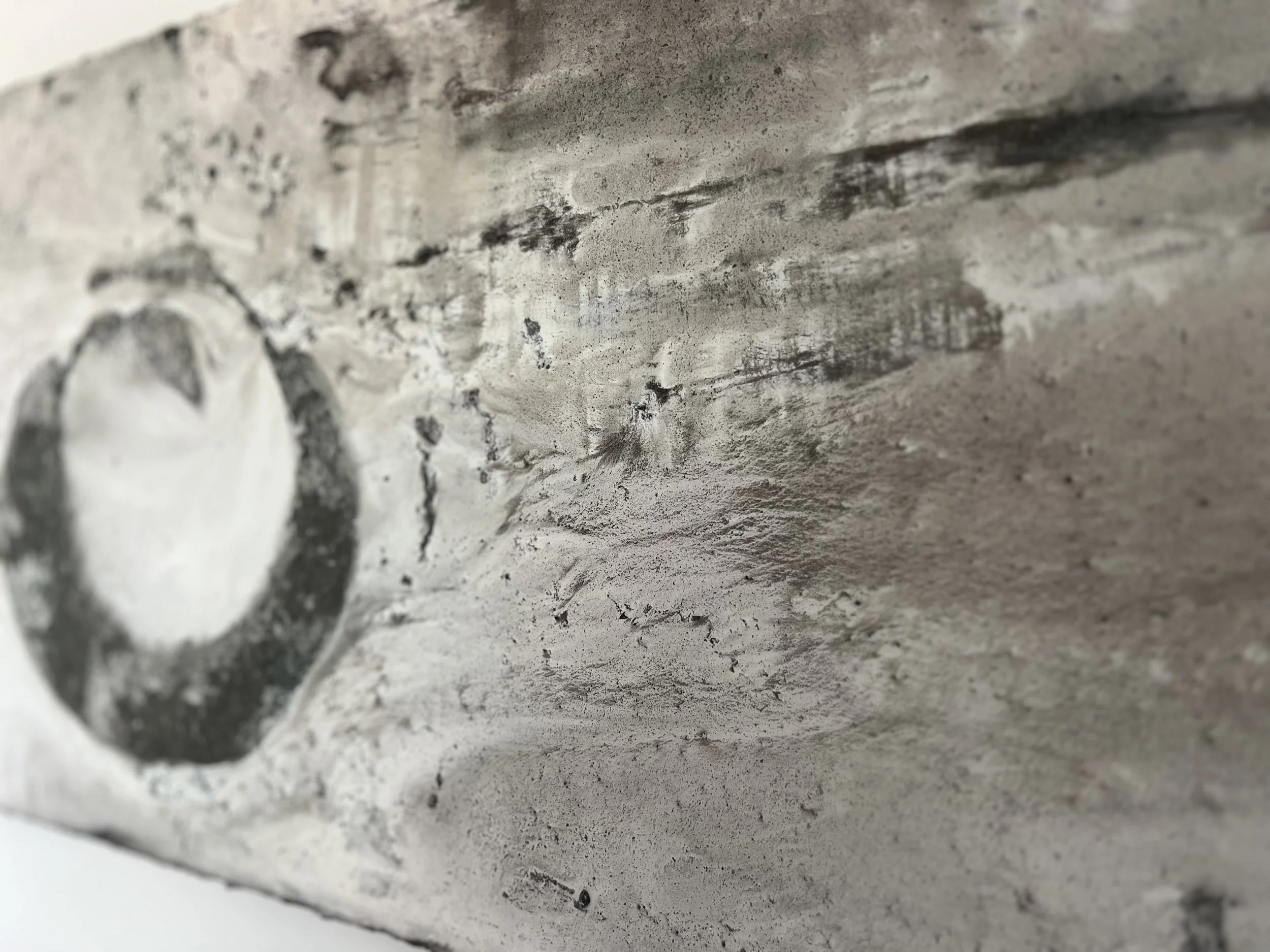 Passing Phase. Inspired by the passing phases between light and dark, this monochromatic work recalls the shadowed surfaces of the moon and volcanic terrain. Formed with earth pigments, salt and rock, it reflects on life’s transitions and the spaces in-between chapters, where shadow reveals structure and texture, holding both tension and possibility.