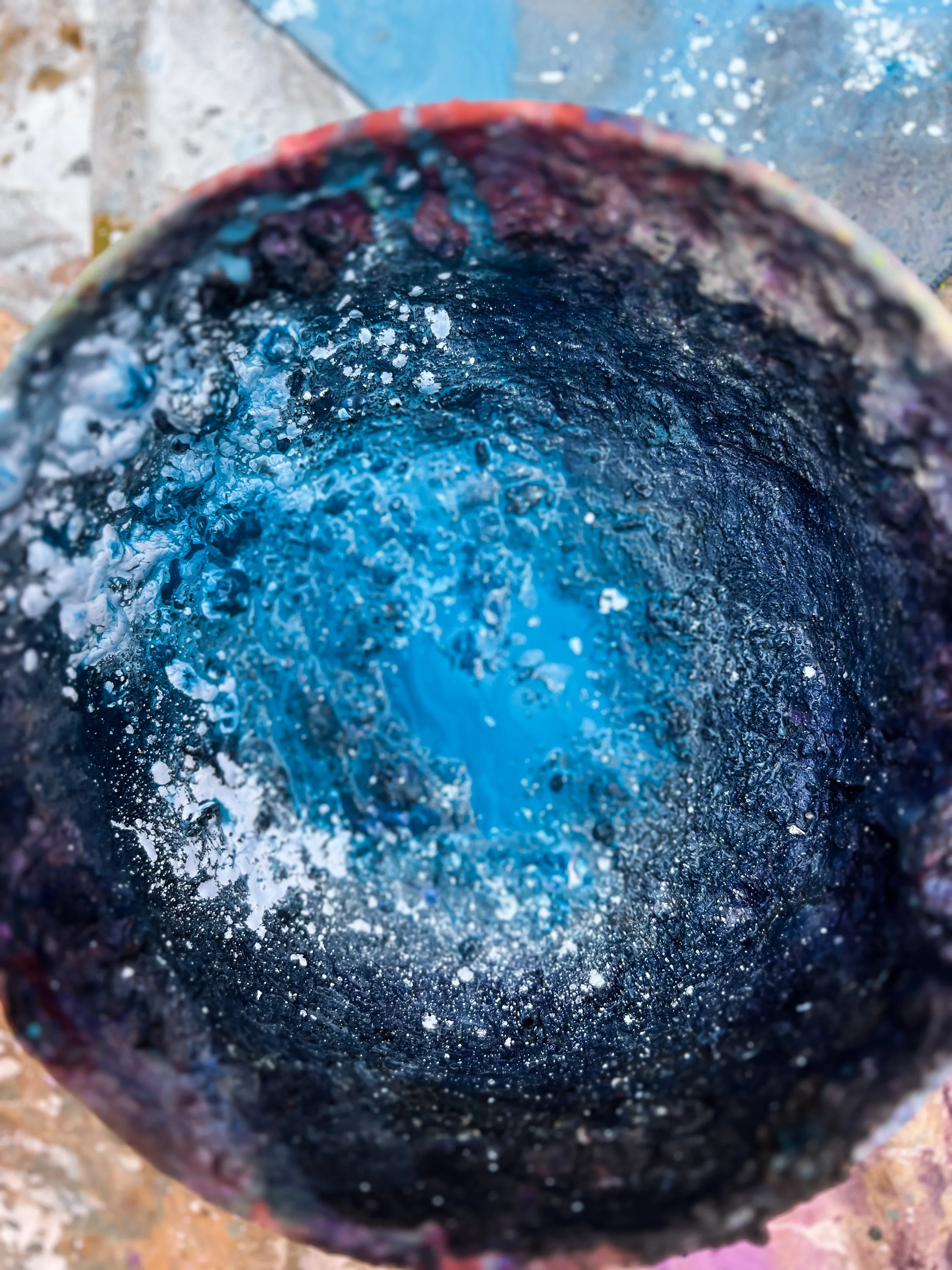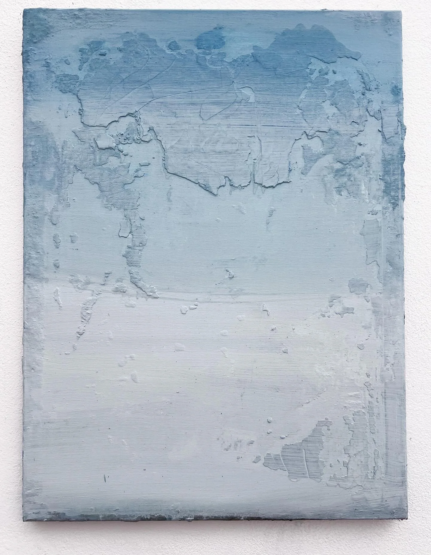Containment. Blues, deep reds, plaster, and brown earth pigments converge in layered tension, evoking emotions frozen in time. The work reflects the weight of what is buried and held beneath the surface, still alive—contained yet pressing to be revealed.